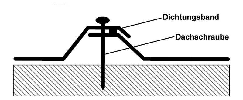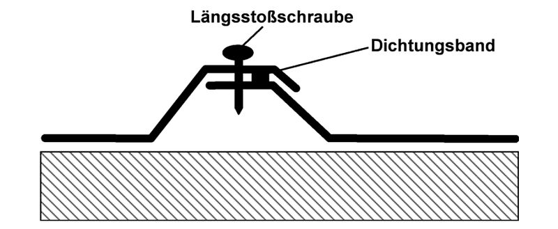 Entsprechend der Dachneigung empfehlen wir den Einsatz von Dichtungsband im Querstoß unter 15°, sowie im Längsstoß unter 7°, wobei zusätzlich der Längsstoß mit Längsstoßschrauben verschraubt werden sollte.