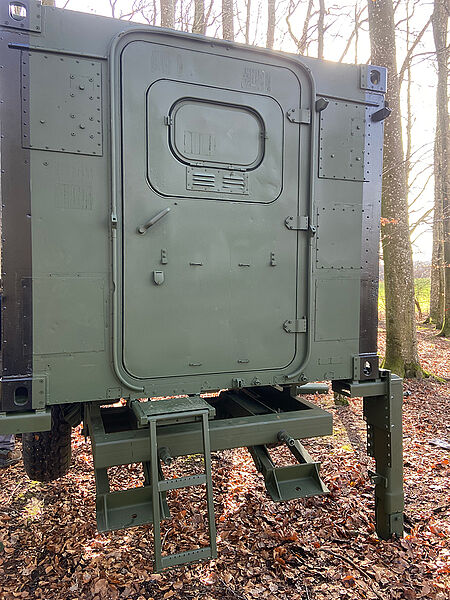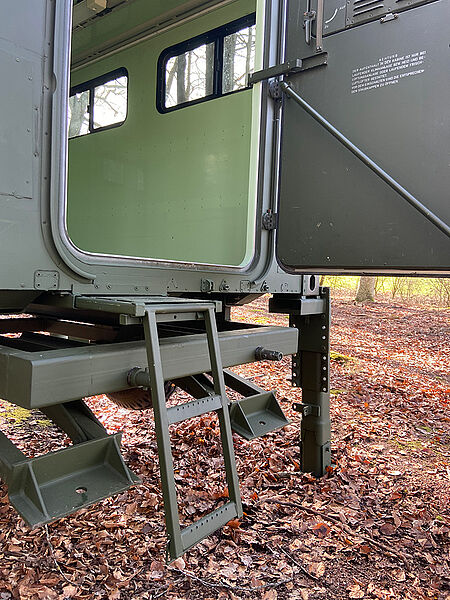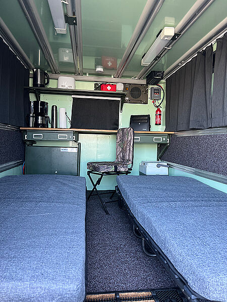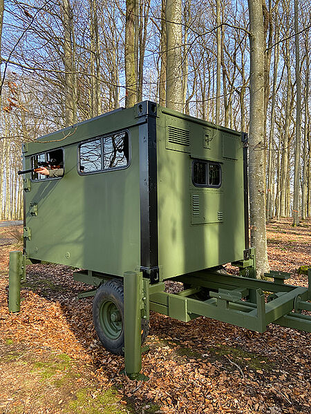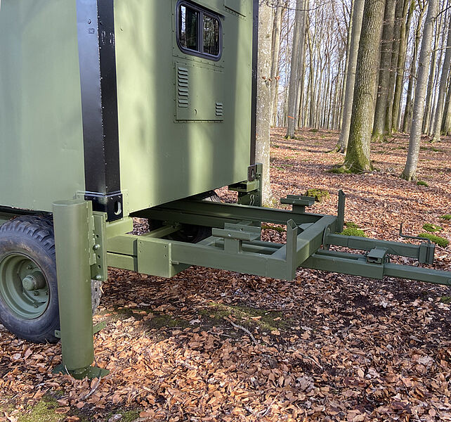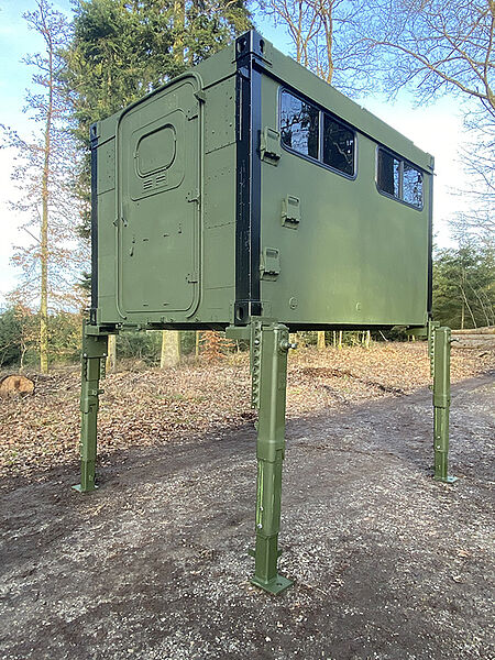 Die Schlafkanzel gibt es wahlweise mit verschiedenen Untergestellvarianten, die über Twistlock-Kupplungen einfach zu montieren sind oder/und mit einem Transportwagen, der ein Bewegen im Revier ermöglicht.
