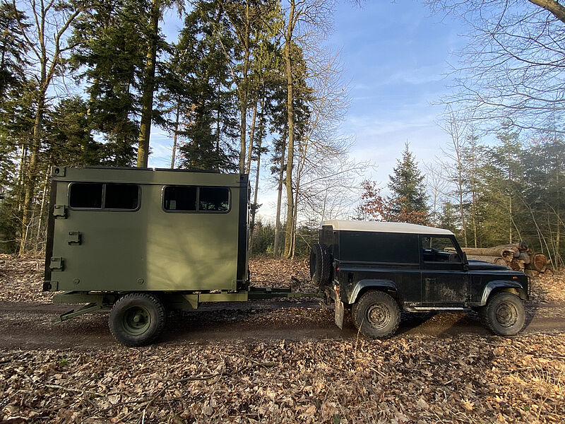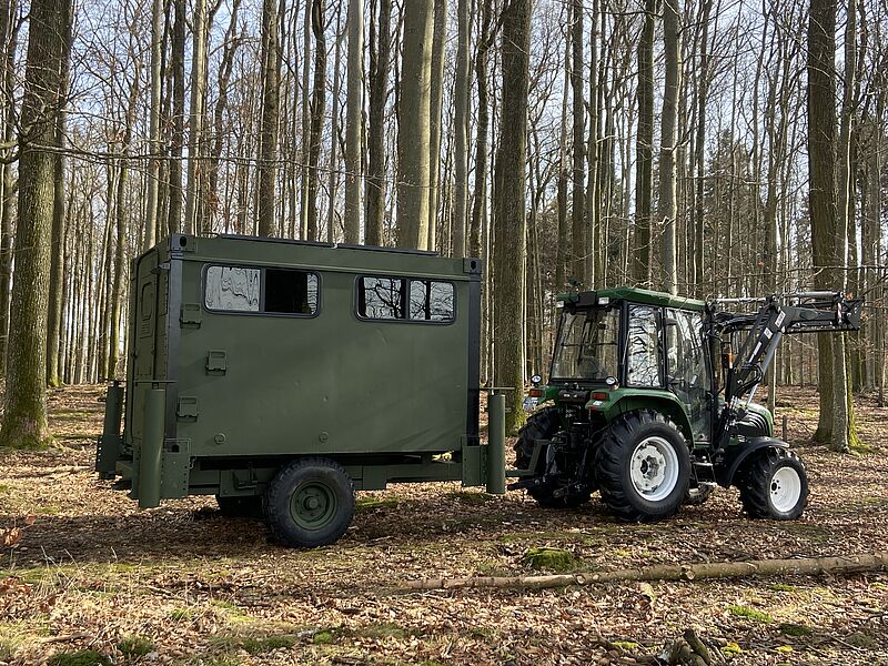 Ein Umsetzen der Schlafkanzel mit Transportwagen ist sowohl mit dem Traktor als auch mit einem geländegängigen PKW problemlos möglich, sodass ggfs. mehrere unserer Schlafkanzelmodelle mit einem Transportwagen versetzt werden können.